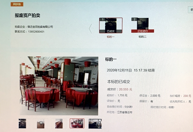12月11日下午3時(shí),城發(fā)公司部分報(bào)廢廚具、桌椅等物資網(wǎng)上拍賣開始,10家競買人,經(jīng)過17分39秒90次的緊張激烈競價(jià),最終以20555元成交標(biāo)的,比評估價(jià)超出10倍。
