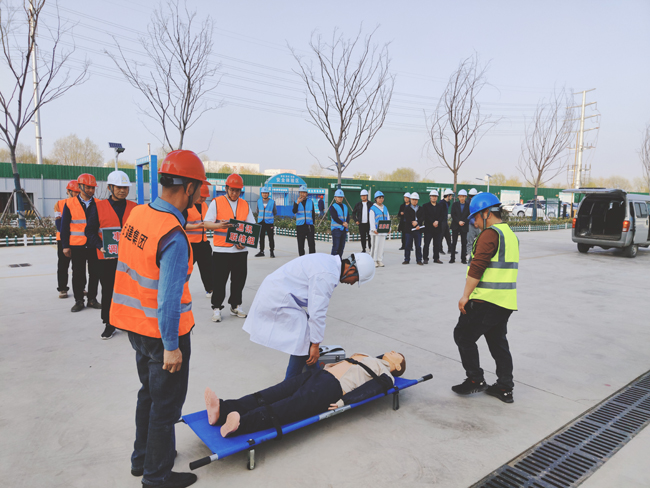 本次演練共分6個小組,分別為:現(xiàn)場模擬組、現(xiàn)場警戒(搶修)組、應(yīng)急救援(疏散)組、通訊聯(lián)絡(luò)組、事故調(diào)查組、 觀摩組。假設(shè)工人在生活區(qū)違規(guī)使用大功率電器突發(fā)火災(zāi),被煙霧和火勢圍困,二樓有人發(fā)出救援信號,正在附近巡查的安全員發(fā)現(xiàn)情況后,立即趕赴現(xiàn)場并打電話給項目生產(chǎn)負責人,在接到通知后,項目生產(chǎn)負責人迅速安排項目部應(yīng)急救援辦公室負責人,并啟動應(yīng)急預(yù)案,各救援小組立即到達現(xiàn)場開展工作,安全員迅速引導全體人員有序從疏散樓梯疏散到安全位置,救援組帶著擔架、急救箱等趕赴現(xiàn)場,將“受傷”人員用擔架從房內(nèi)撤離到安全位置,同時救援醫(yī)生對“受傷”人員進行簡單的心肺復蘇、人工呼吸,并迅速送往醫(yī)院進行治療。