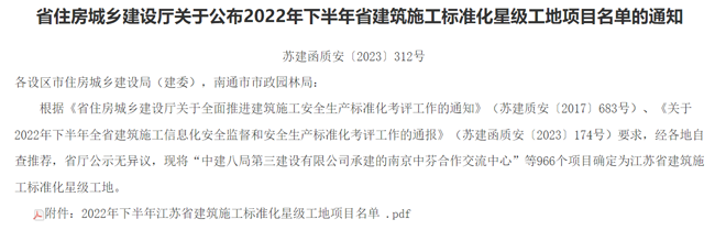 近期,省建設(shè)廳下發(fā) 《 關(guān)于公布2022年下半年江蘇省建筑施工標準化星級工地公示名單 》的通知,城發(fā)公司投資建設(shè)的青年公寓一期土建及安裝工程喜獲“江蘇省建筑施工標準化星級工地”(二星)稱號。該榮譽的獲得是公司扎實推進省安全生產(chǎn)標準化建設(shè),落實上級關(guān)于推進安全生產(chǎn)標準化建設(shè)工作部署的要求,建立健全管理機制,積極開展安全文明標準化工地創(chuàng)建所取得的成果,為全省樣板化示范,有效提升建筑施工水平,安全生產(chǎn)發(fā)揮了引領(lǐng)作用。