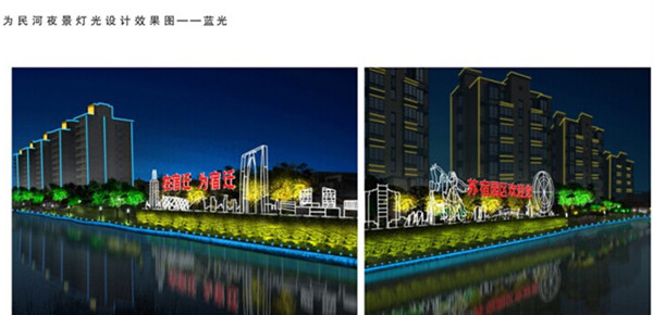 在園區(qū)東入口為民河的一畔,一座座生動的城市剪影燈光造型在青海湖西路兩側(cè)一字排開。有象征著新加坡元素的“魚尾獅”,有蘇州工業(yè)園區(qū)金雞湖畔的東方之門、摩天輪和李公堤,還有西楚霸王項羽騎馬的颯爽英姿。造型以蘇州、宿遷和新加坡城市建筑輪廓線、城市主題雕塑為基本元素,以剪影形式為載體,以現(xiàn)代高科技LED燈光為表現(xiàn)手段,通過炫麗動感的光影效果,在夜色中描繪出了一副靚麗多姿的畫卷,生動地展現(xiàn)出了園區(qū)“從新加坡到蘇州再到宿遷”和“在宿遷、為宿遷”的發(fā)展理念。