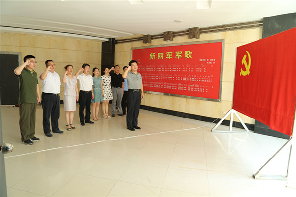 在黃花塘新四軍紀(jì)念館,全體黨員干部觀看了實(shí)物展覽和文字圖片介紹,直觀地感受和體會(huì)了新四軍革命先烈在硝煙彌漫的年代,用鮮血和生命爭(zhēng)取人民解放的偉大奉獻(xiàn)精神,學(xué)習(xí)了陳毅、粟裕等老一輩無(wú)產(chǎn)階級(jí)革命家敢為人先、顧全大局、不畏犧牲、艱苦奮斗的優(yōu)良傳統(tǒng)。在紀(jì)念館大廳,全體黨員面對(duì)鮮紅的黨旗,莊嚴(yán)地舉起右拳齊聲宣誓,重溫了入黨誓詞。