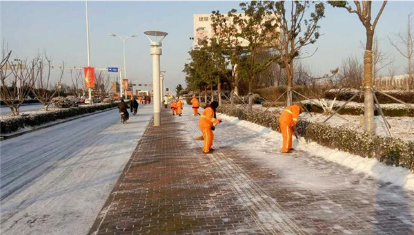 清晨6時,市政部工作人員和環(huán)衛(wèi)工人已經(jīng)開始對轄區(qū)部分主要路段進行除雪除冰作業(yè)。在凜冽寒風中,他們不畏嚴寒,經(jīng)過近3 小時的清掃除冰,截至當天上午9時,青海湖西路、通達大道、紫金山路等主干道及蘇州公園人行道已基本完成路面積雪清掃。