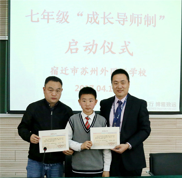 近日,宿遷市蘇州外國語學(xué)校七年級16位孩子和他們的家長監(jiān)護(hù)人還有他們新認(rèn)的“干爹”“干媽”齊聚學(xué)校階梯教室,舉行隆重的簽約儀式。這些“干爹”“干媽”是學(xué)校給首批孩子們配的成長導(dǎo)師,每位教師與一個孩子結(jié)對,全方位關(guān)心孩子的成長,陪伴孩子們一起度過快樂而充實的初中生活,力求“個個進(jìn)步,人人成星”?!俺砷L導(dǎo)師制”這種親情化、個性化、人本化的育人模式,是宿蘇外實施素質(zhì)教育,提升教育核心競爭力的需要;是宿蘇外服務(wù)家長,擴(kuò)大教育品牌影響力的需要;是宿蘇外回報社會,落實“兩聚一高”,建設(shè)和諧社會的需要。